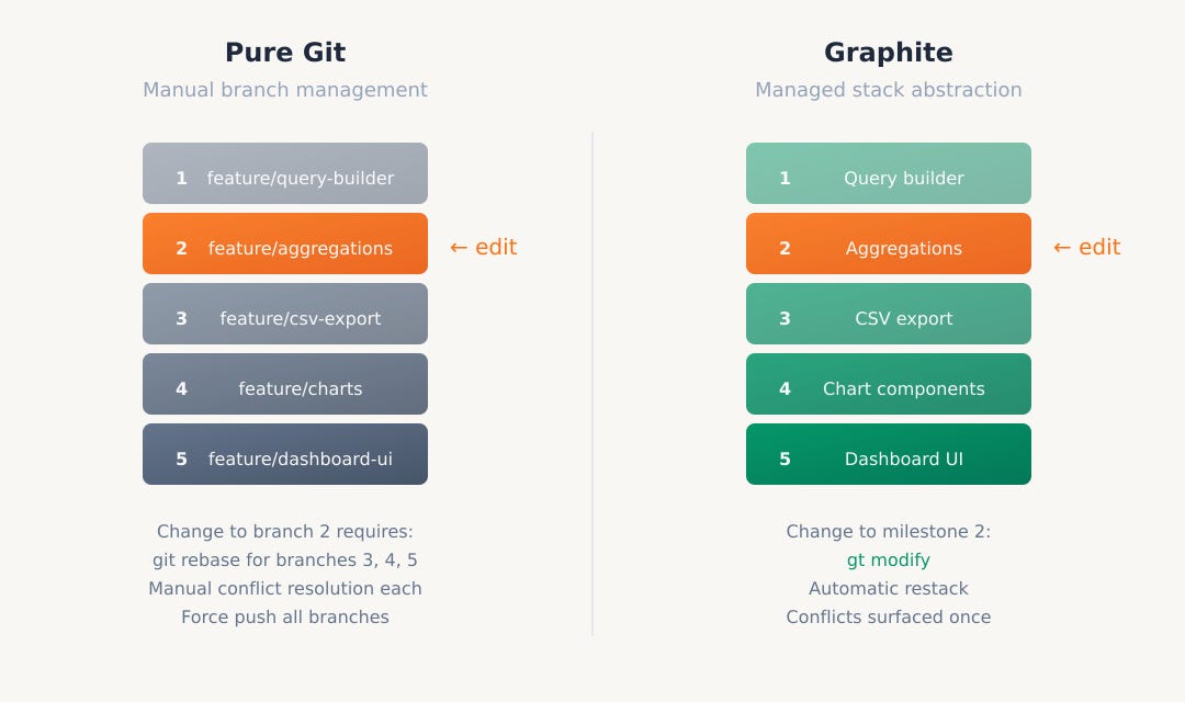 Graphite emerged from alumni of those companies that missed using that workflow. You can technically do stacked PRs with pure git. Create a branch, make a commit, create another branch off that one, make another commit, and so on. The problem comes when you need to make a change to a PR near the bottom of the stack. You have to rebase every branch above it, resolve conflicts at each step, and force push all of them. It becomes unwieldy fast.