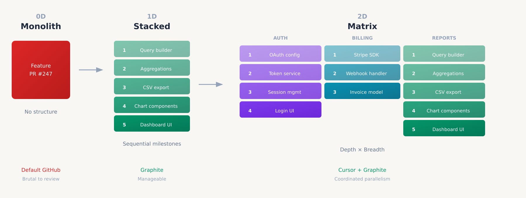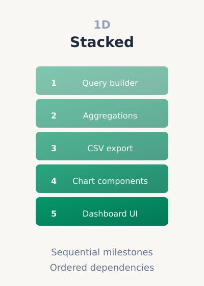Each milestone is a checkpoint. If milestone three has a problem, you can address it without unwinding milestones one and two. The work has a structure that survives contact with reality. One-dimensional stacking is manageable with discipline and tooling. The limitation is that you are still working on one feature at a time.