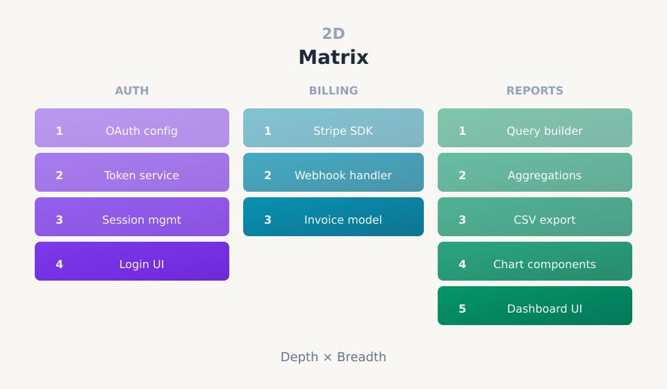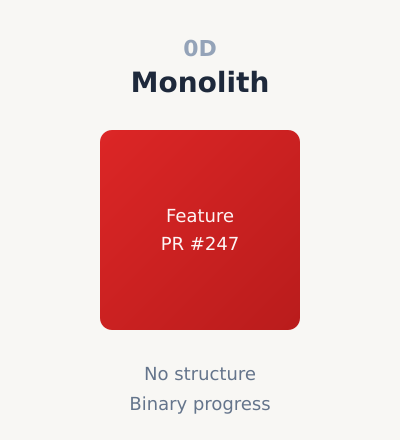 The progression from zero to one to two dimensions is about the richness of representation. A monolith tells you nothing about structure. A stack encodes sequential dependencies within a feature. A matrix encodes the full topology of work in progress.