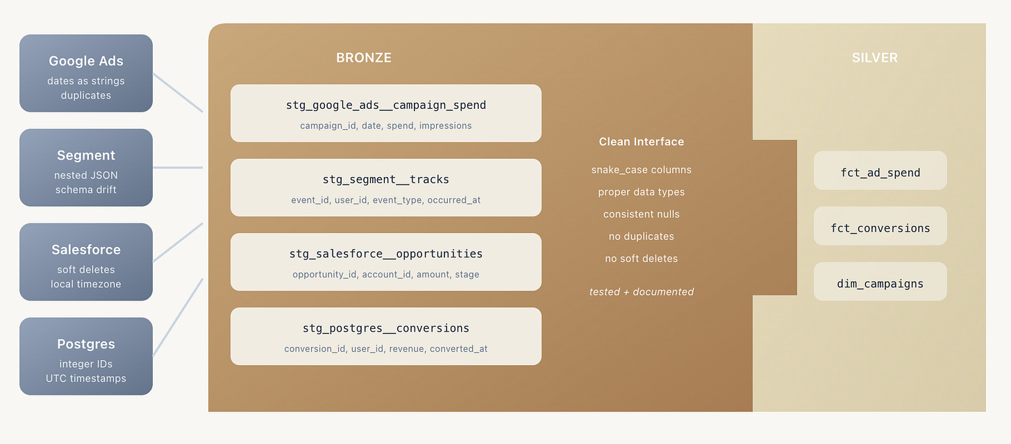 Silver doesn’t need to know that Google Ads has inconsistent date formats or that Segment events arrive as nested JSON. Bronze has already handled that.