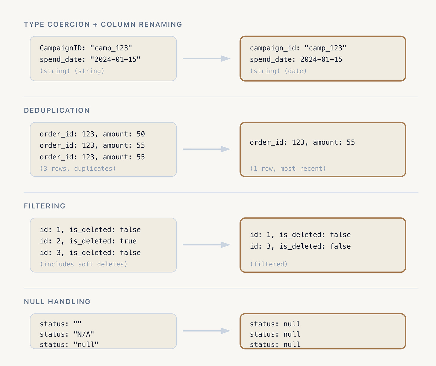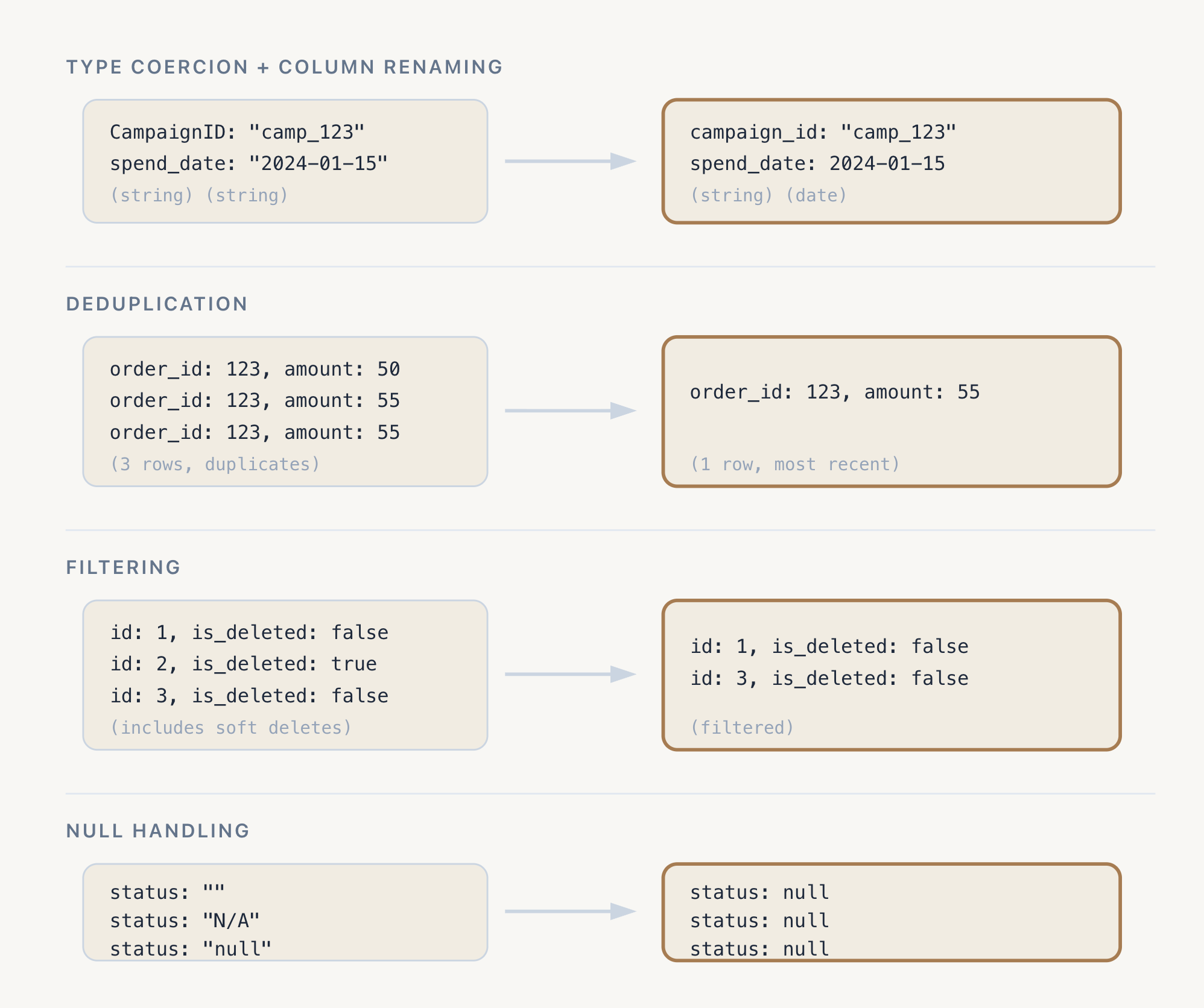 Source systems have their own conventions, and we standardize to our team’s type and naming standards here. Date strings are cast to the appropriate date types. Numeric strings become numbers. The goal is a consistent schema that downstream models can predictably rely on.