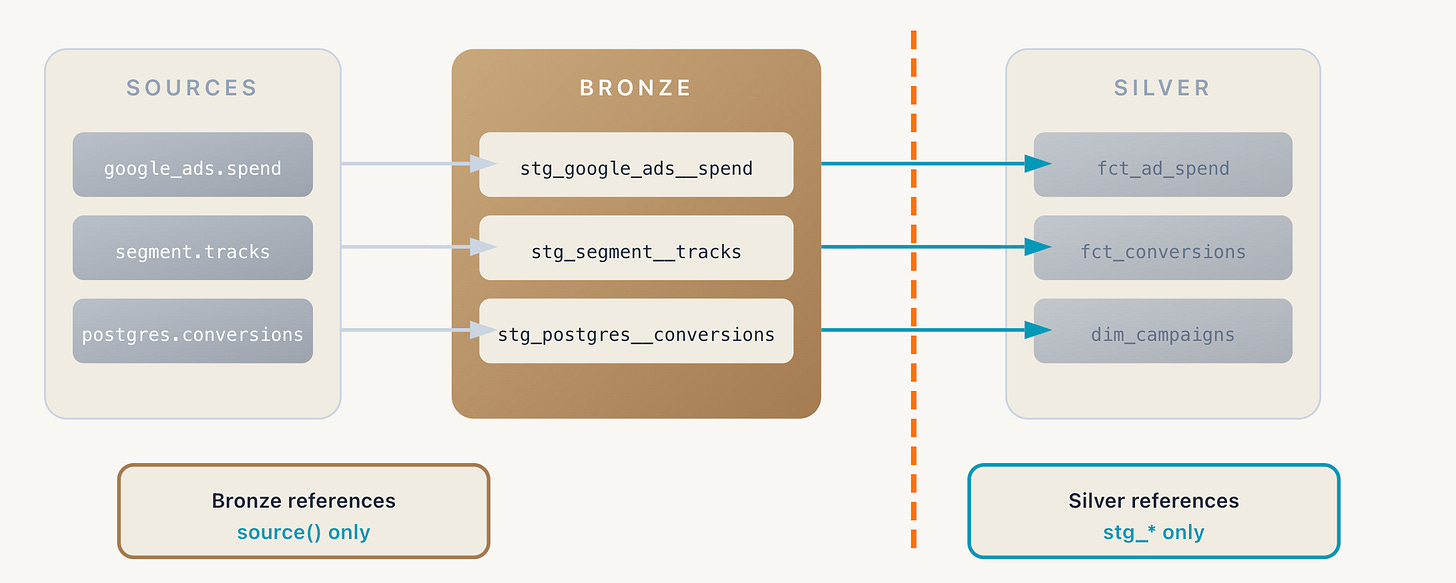 The interface between Bronze and Silver is clean. Silver models reference staging models by name and trust that the contracts are enforced.